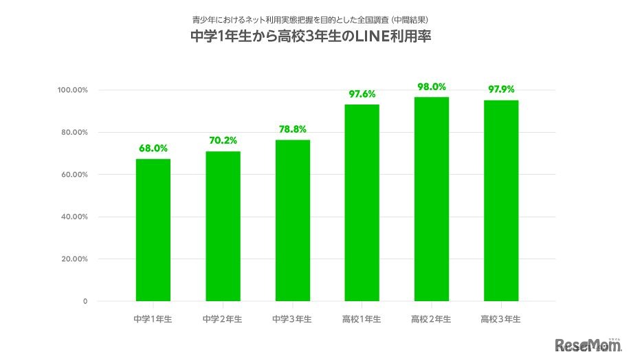 中学1年生から高校3年生のLINE利用率(2016年6月~9月調査)