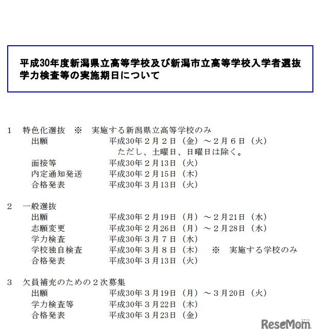 平成30年度(2018年度)の新潟県立高校および新潟市立高校入試は、特色化選抜が2月13日、一般選抜が3月7日(学校独自検査を行う場合は3月8日)、2次募集が3月22日に実施される。