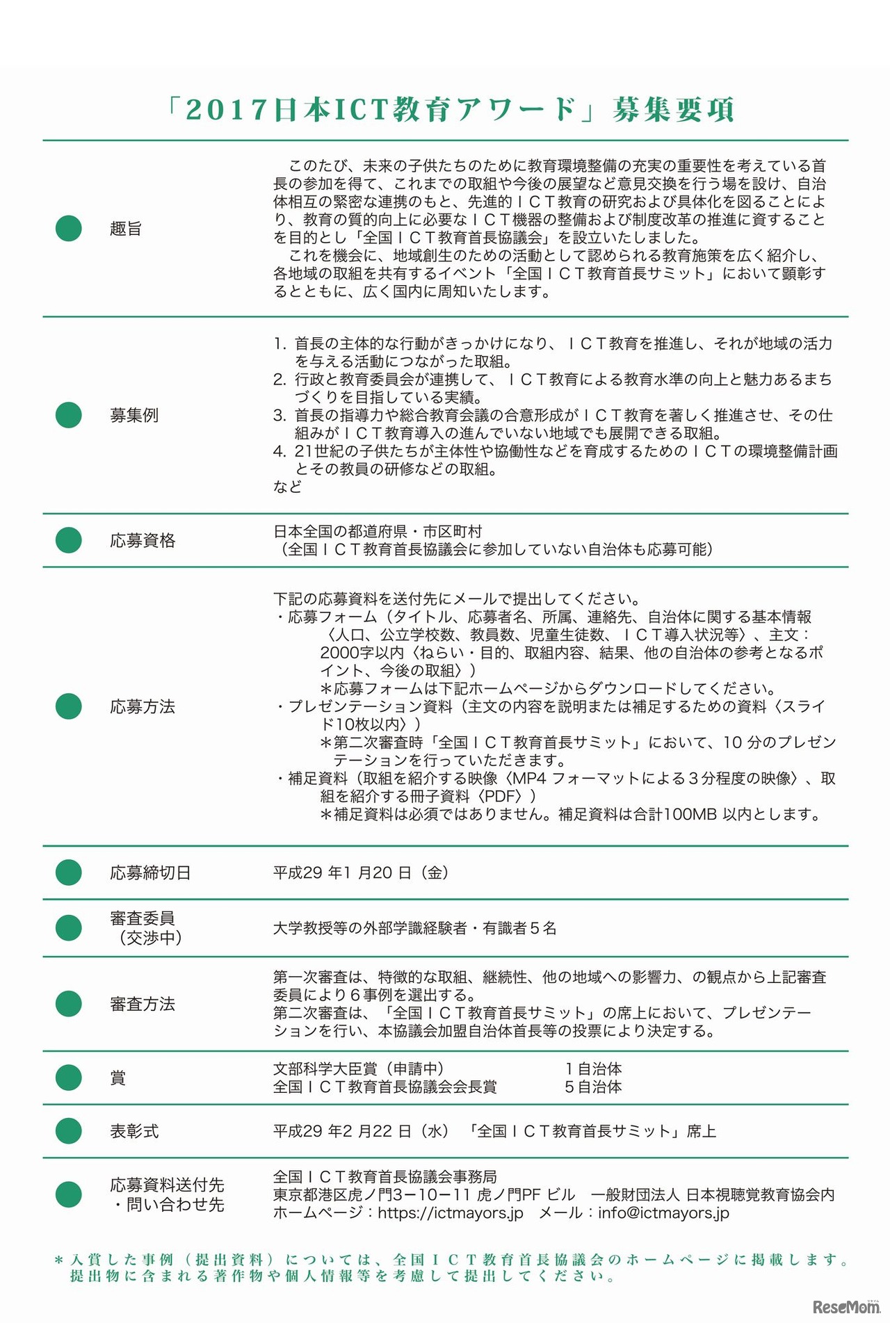 全国ICT教育首長協議会は、平成29年1月20日まで全国の都道府県・市区町村を対象に「2017日本ICT教育アワード」の応募を受け付けている。ICT教育首長協議会のモデルケースとしてふさわしく、ほかの地域でも展開できる活用例を募集している。