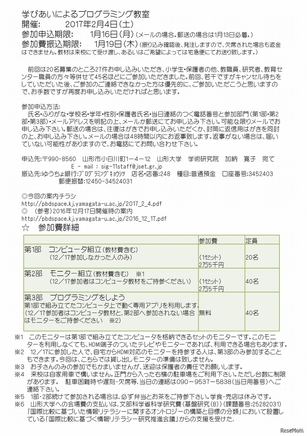 学びあいによるプログラミング教室 参加費詳細 ※2017/1/30更新