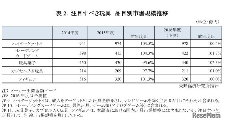 矢野経済研究所は1月10日、玩具市場に関する調査結果を発表した。2015年度の国内玩具市場規模は、主要9品目で前年度比1.3%減の6,407億円、テレビゲームを除いた主要8品目で前年度比1.3%増の3,467億円となった。