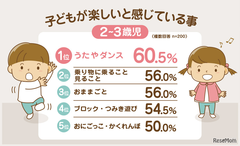 2~6歳の幼児が「今楽しい」と感じているものが「うたやダンス」「おにごっこ・かくれんぼ」であることがドラキッズの意識調査でわかった。からだを動かして友達と遊ぶことがイマドキ幼児のトレンドのよう。あわせて母親の教育事情や子育ての悩みについても調査している。