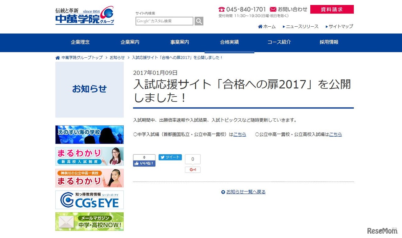 神奈川県を中心に学習塾を展開する中萬学院は2017年1月9日、入試応援サイト「合格への扉2017」を公開した。「中学入試編」と「公立中高一貫校・公立高校入試編」に分け、出願倍率や入試結果、入試トピックスを随時更新していく。