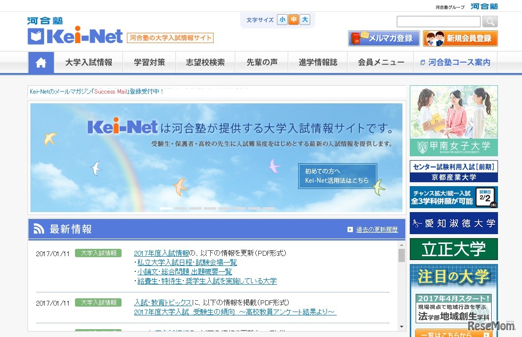 Kei-Netは1月11日、2017年度入試情報を更新し、私立大学入試日程・試験会場、小論文・総合問題出題概要、給費生・特待生・奨学生入試を実施している大学を掲載した。全国の大学がそれぞれの一覧にまとめられている。