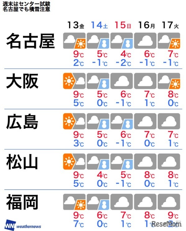 大学入試センター試験本番まで残りあと2日、1月14日と15日の天気はどうなるのか。ウェザーニュースによる最新の天気情報によると、今季最強の寒波が到来しており、北陸は災害レベルの大雪に警戒。名古屋など一部の地域では積雪に注意だという。
