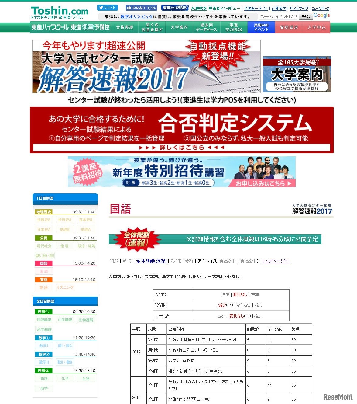 東進ドットコムは1月14日、平成29年度(2017年度)センター試験初日の「国語」全体概観の速報を掲載した。このあと、より詳細な分析や、問題・解説・解答のほか、新高校2・3年生向けのアドバイスも掲載予定。