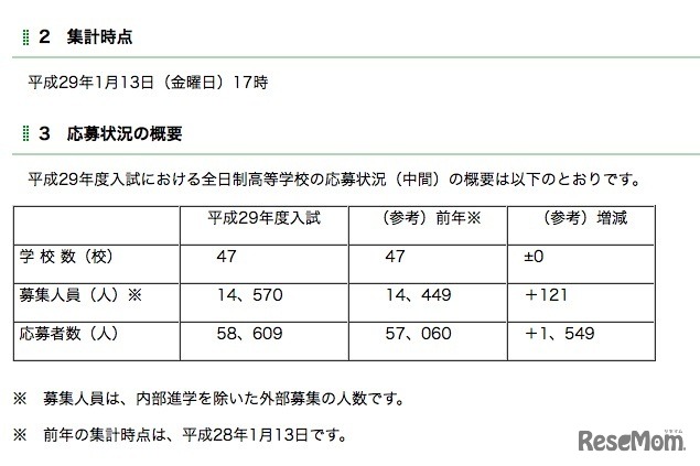 埼玉県は平成29年1月18日、平成29年度(2017年度)埼玉県私立高等学校入試の中間応募状況を公表した。1月13日午後5時時点での応募状況を取りまとめたもので、募集人員1万4,570人に対して、応募者数は5万8,609人、平均倍率は4.02倍となった。