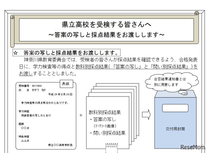 神奈川県教育委員会は、平成29年度(2017年度)の県立高校入試において、受験生に答案の写しと学力検査の採点結果を交付する方針を決め、1月19日にWebサイト上でサンプルなどを公開した。採点結果は、合格発表日に渡される。