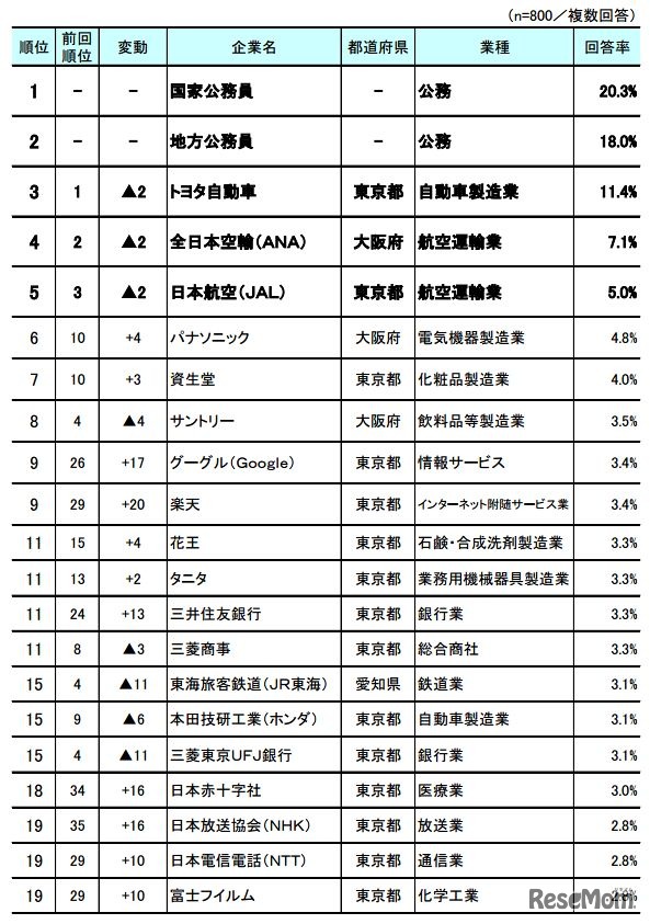 リンクモンスターは1月27日、「お子さん/お孫さんに勤めてほしい企業」に関する調査結果を発表した。調査時期は2016年11月26日~27日で、未成年の子・孫を持つ20~69歳の男女個人、計800人から回答を得た。今回で第5回目の調査となる。