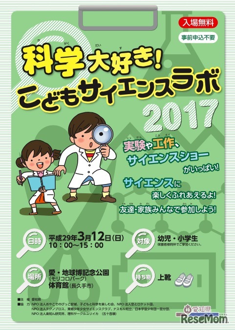 愛知県は、県内各地でサイエンスイベントを行っているNPO法人やサークルの協力のもと「科学大好き!こどもサイエンスラボ2017」を3月12日に開催する。対象は幼児から小学生。事前の申込み不要、入場無料でさまざまな科学実験や工作に参加できる。