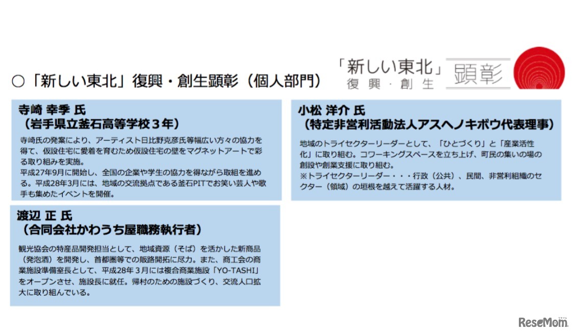 復興庁は、現在被災地で進む「新しい東北」の実現に向けた取組みについて、大きく貢献している個人・団体の活動を顕彰するべく「新しい東北」復興・創生顕彰および「新しい東北」復興功績顕彰を実施。釜石高校3年生や多賀城高校など20の個人・団体を選定した。