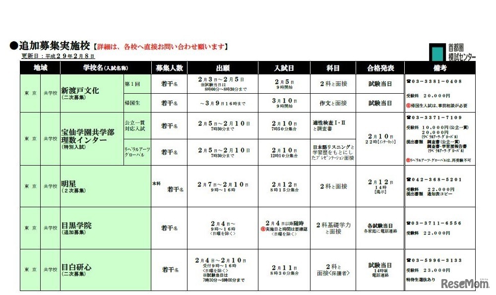 首都圏模試センターは2月8日、宝仙学園共学部理数インター、明星、東京立正など追加募集を実施する中学校の入試情報を公開した。募集人数、出願期間、入試日、試験科目などが一覧で掲載されている。
