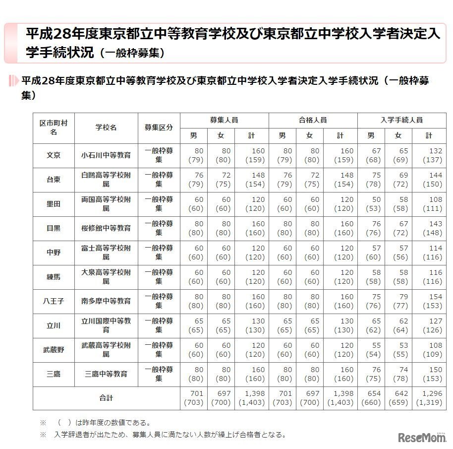 東京都立中高一貫校の一般枠募集の合格発表が2月9日に行われた。入学手続きの締切りは2月10日正午までとなっており、繰上げ合格は2月10日~2月末日に決定する。なお、平成28年度は全10校で計102人が繰上げ合格となった。