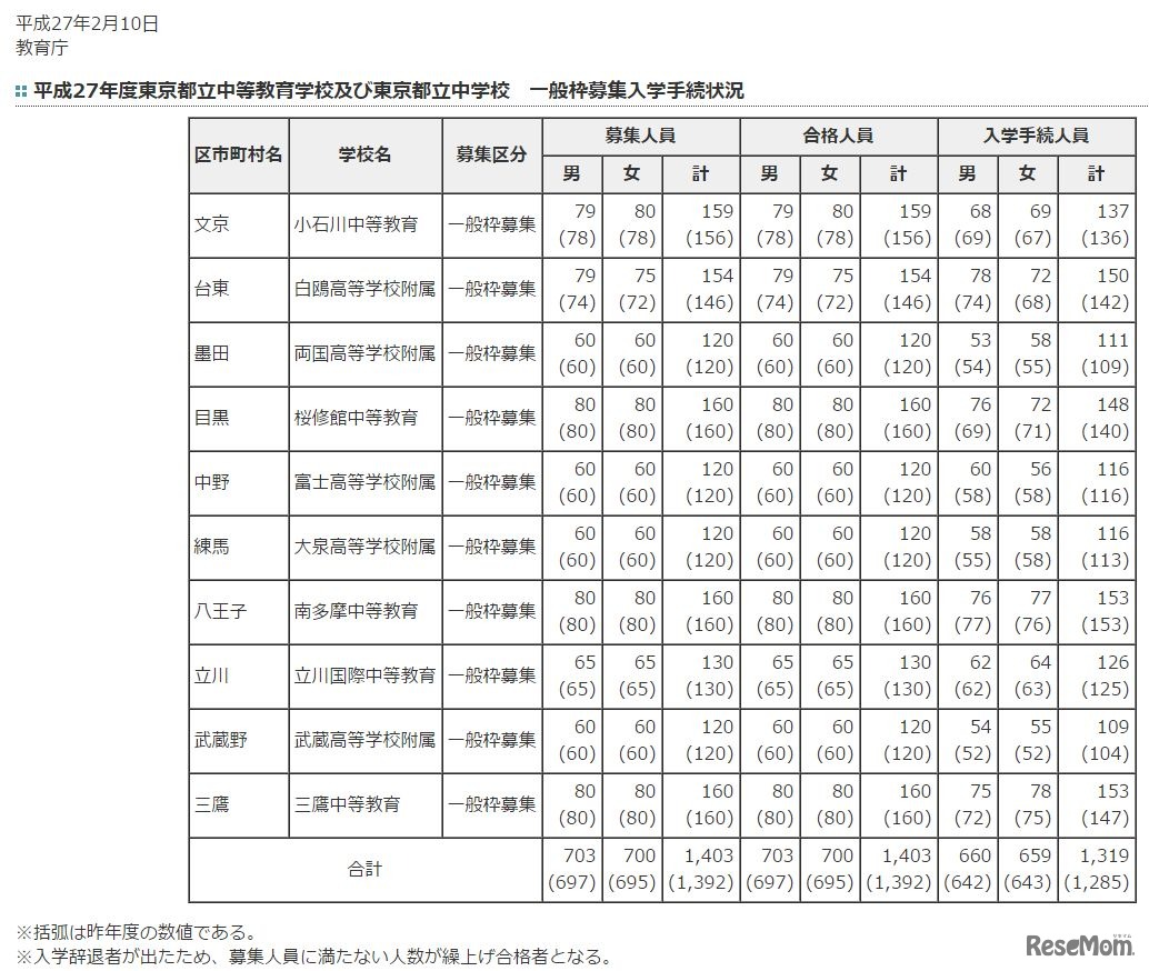平成27年度東京都立中等教育学校および東京都立中学校 一般枠募集入学手続状況