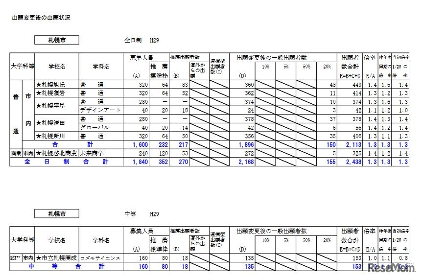 北海道教育委員会は平成29年2月14日、平成29年度(2017年度)北海道立高等学校入学者選抜の出願変更後の出願状況を発表した。1月27日に発表された当初倍率と比較すると、札幌西が1.6倍から1.5倍、札幌東と札幌北が1.4倍から1.3倍に下がった。