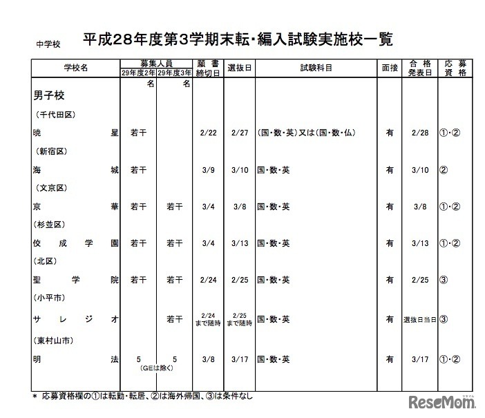 東京都は2月16日、平成28年度(2016年度)第3学期末に転・編入試験を実施する都内私立中学校と高等学校について公表した。都内の中学校99校、高等学校118校(そのうち全日制は109校)が転・編入試験を実施する。