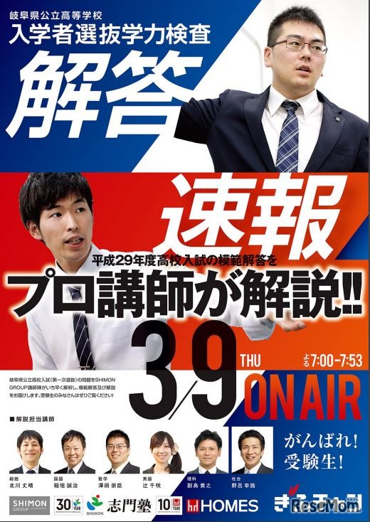 岐阜放送(ぎふチャン)は、平成29年3月9日に実施される岐阜県公立高等学校入学者選抜学力検査の解答速報を入試当日の午後7時~7時53分に放送する。解説は、SHIMON GROUP講師陣が務める。