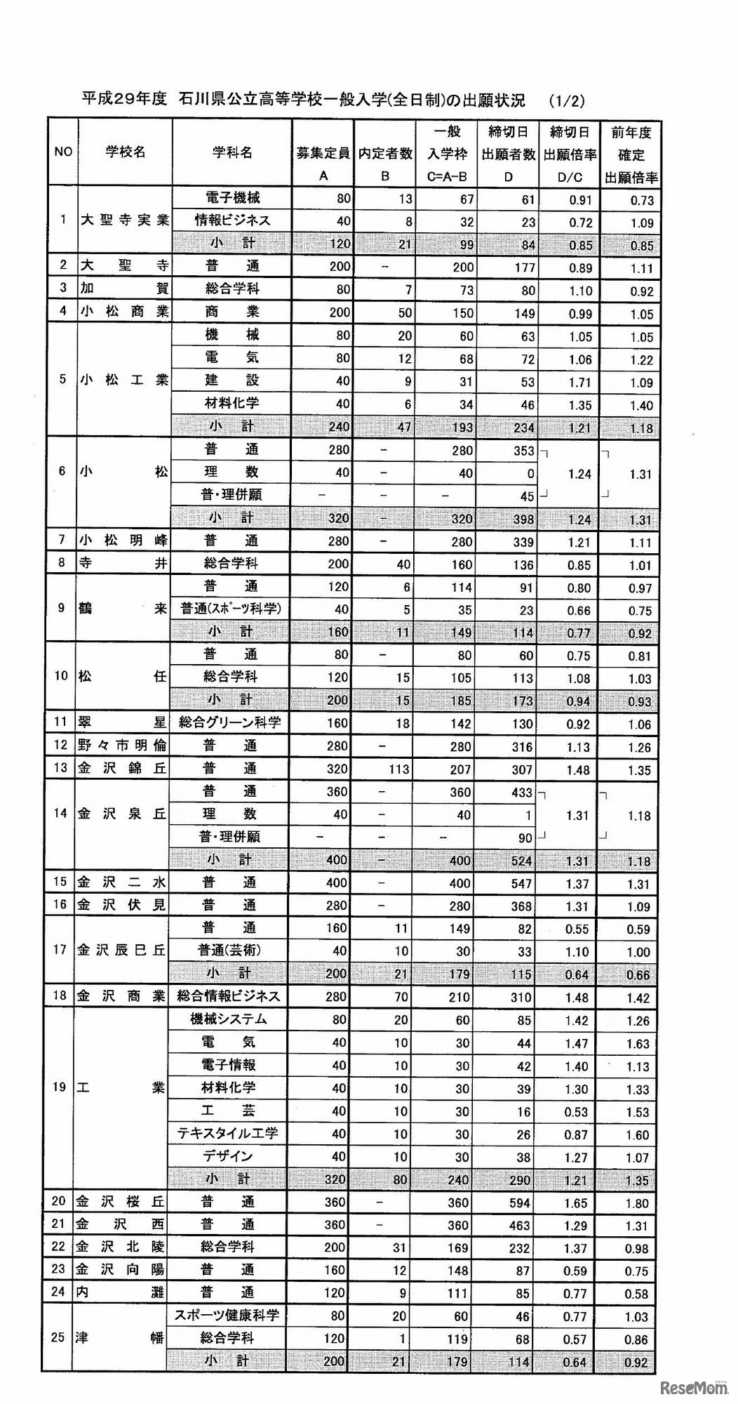 石川県は平成29年2月21日、平成29年度(2017年度)石川県公立高等学校入学者選抜のうち、一般入学全日制の出願状況を公開した。入学者選抜を実施する公立高等学校は、40校68学科6コース。