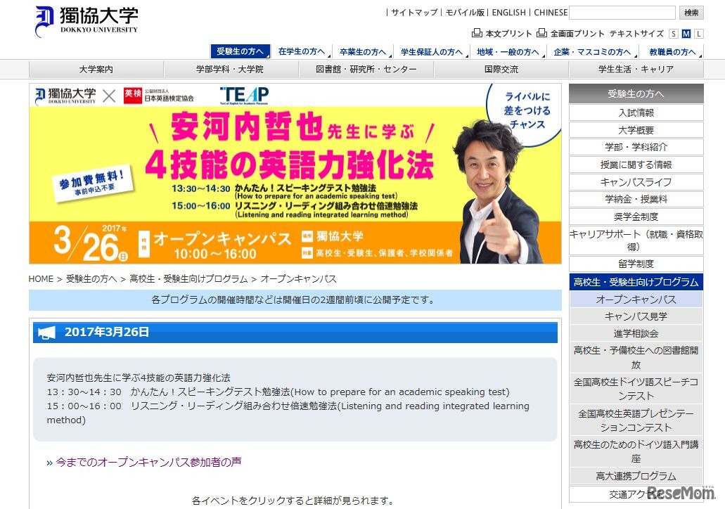 グローバル教育を進める神田外語大学や獨協大学では、春休みに高校生向けの英語授業を行う。神田外語大学は3日間集中型の少人数制外国語レッスンを開催。獨協大学では、春のオープンキャンパスで著名な予備校講師が4技能の英語強化法の授業を開催する。