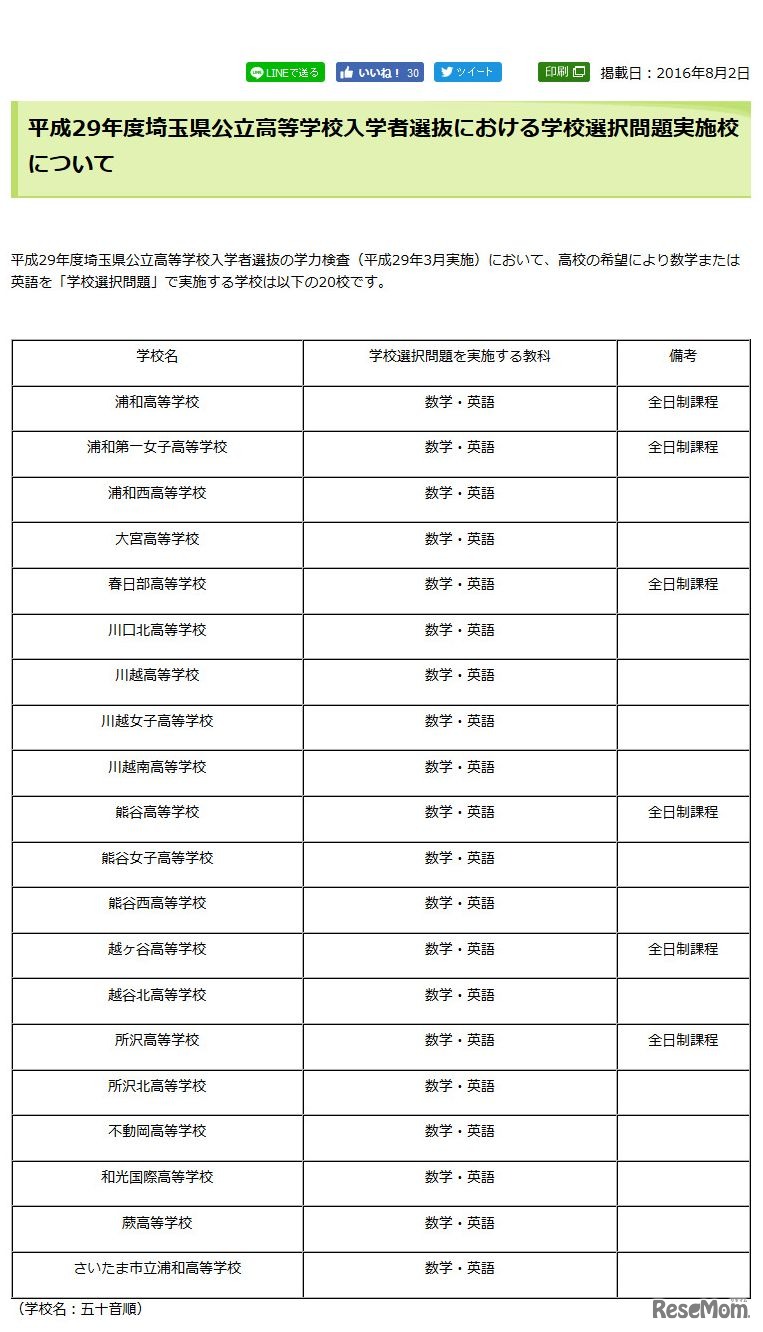 平成29年度 埼玉県公立高等学校入学者選抜 学校選択問題を実施する学校(一覧)