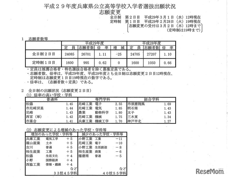 兵庫県公立高校入試が平成29年3月12日に行われるのに合わせ、サンテレビでは入試当日の午後8時より入試解答速報を放送する。兵庫県教育委員会によると、志願変更2日目、3月1日時点の全日制の出願倍率は1.11倍。志願変更は3月2日まで受け付ける。