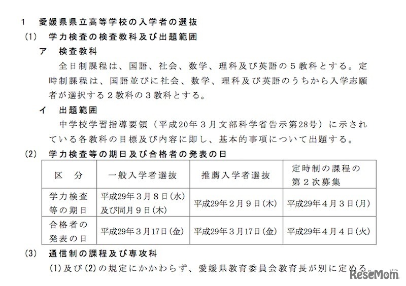 愛媛県教育委員会は3月2日、平成29年度(2017年度)愛媛県立高等学校の入学選抜における志願者数(志願変更後)を発表した。全日制の募集人員9,365人に対して8,790人(推薦入学確約者数を含む)が志願し、確定倍率は0.94倍となった。