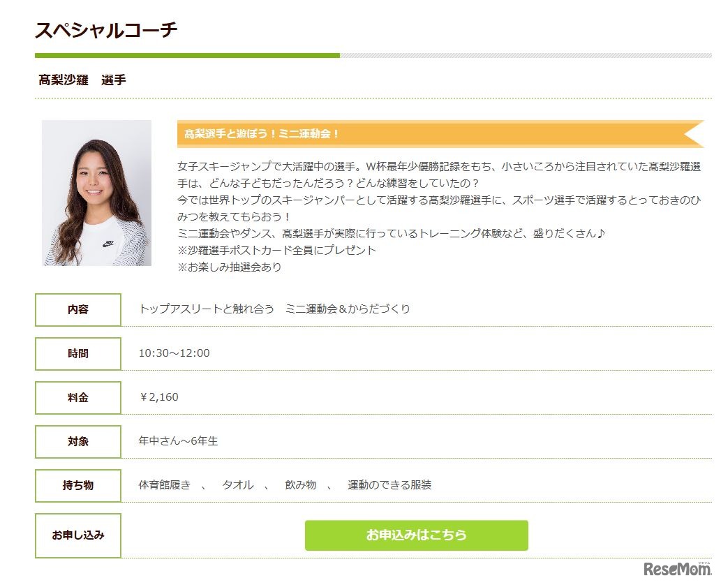 体育指導のスタートラインが「春のスポーツフェスタ」を4月22日、品川区総合体育館で開催する。幼児や小学生を対象にスキージャンプの高梨沙羅選手などトップアスリートを迎え、ミニ運動会やトレーニング体験など楽しい企画を用意。事前申込と参加費が必要。