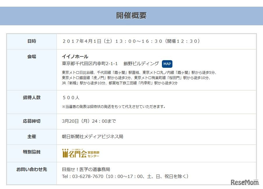 朝日新聞社は4月1日、医学部志望の中高生を応援する特別企画イベント「目指せ!医学の道」を開催し、500人を無料招待する。現役の医師や女子医学部生、名門会の医学部受験指導責任者らが登壇し、講演やパネルディスカッションを展開するほか、無料個別相談もある。