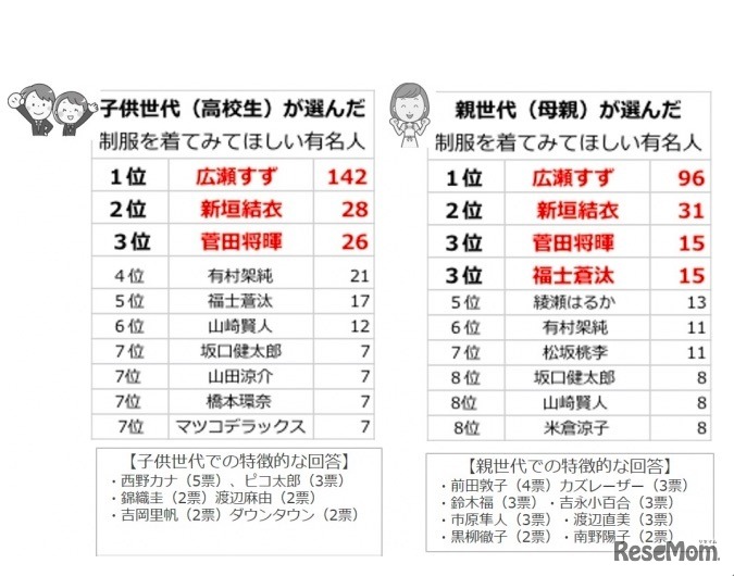学生服のトンボは、学生服ブランドが行う活動の一環として「学生服に関する意識調査」を実施。第1弾として発表された結果によると、回答した母親・高校生ともに「制服が似合う有名人」は広瀬すずがトップで、上位4位まで同じ人物が選ばれている。
