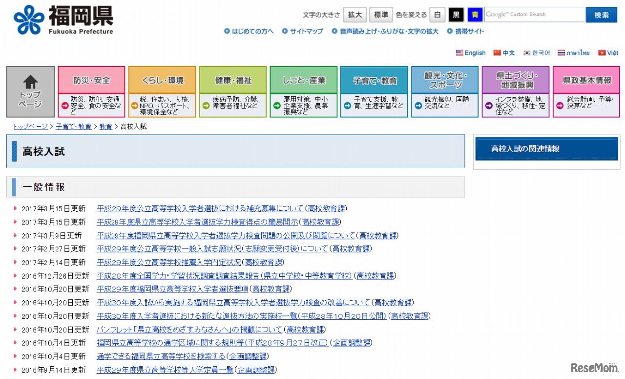 福岡県は平成29年3月15日、平成29年度(2017年度)の公立高等学校入学者選抜において、補充募集を行う高校を発表した。全日制の県立高校16校の26学科・コースで688名、組合立高校1校の3学科・コースで15名を募集する。市立高校では実施校はない。