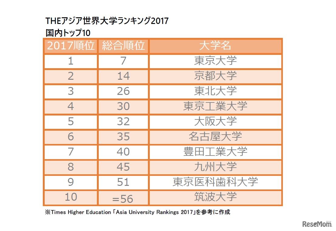 英タイムズ・ハイヤー・エデュケーション(Times Higher Education、THE)は3月16日(現地時間)、Asia University Rankings 2017(アジア世界大学ランキング2017)を発表した。総合1位は2年連続でシンガポール国立大学。