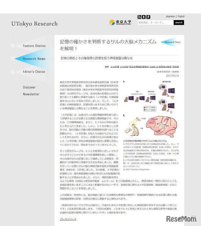 東京大学と順天堂大学は、自身の記憶を内省的に評価する「メタ記憶」の神経基盤を解明したことを発表した。「メタ記憶」が記憶実行機能自体とかい離することがわかり、脳機能に基づいた教育法の開発や高次脳機能障害の診断・治療法確立に貢献できると期待される。