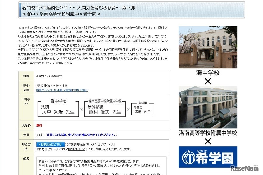 希学園は5月12日、名門校コラボ座談会を開催する。2017年度の第1弾となる今回は、「灘中×洛南高等学校付属中×希学園」。対象は小学生の保護者。入場料は無料。参加申込みは、Webサイトもしくは電話にて受け付けている。