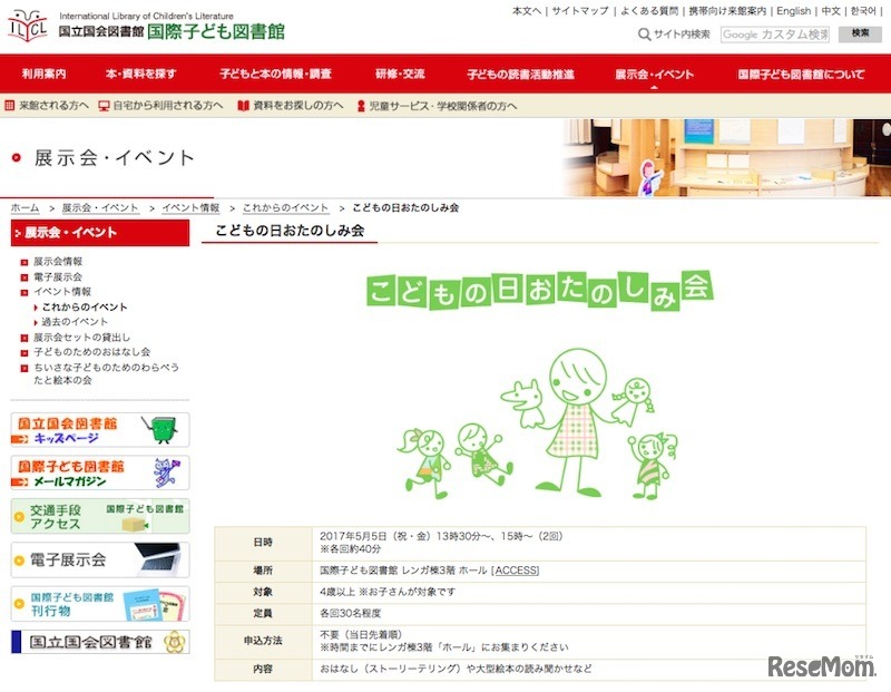 上野公園にある「国際子ども図書館」は、5月5日のこどもの日に4歳以上の子どもを対象とした「こどもの日おたのしみ会」を開催する。事前申込不要で、おはなし(ストーリーテリング)や大型絵本の読み聞かせなどを行う。