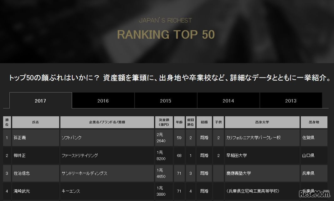世界有数の経済誌、米Forbes(フォーブス)は4月6日(現地時間)、日本長者番付2017(Japan's 50 Richest)を発表した。1位は2年振りに孫正義氏に決定。資産額は2兆2,640億円。トップ50の長者出身大学1位は慶應義塾大学だった。