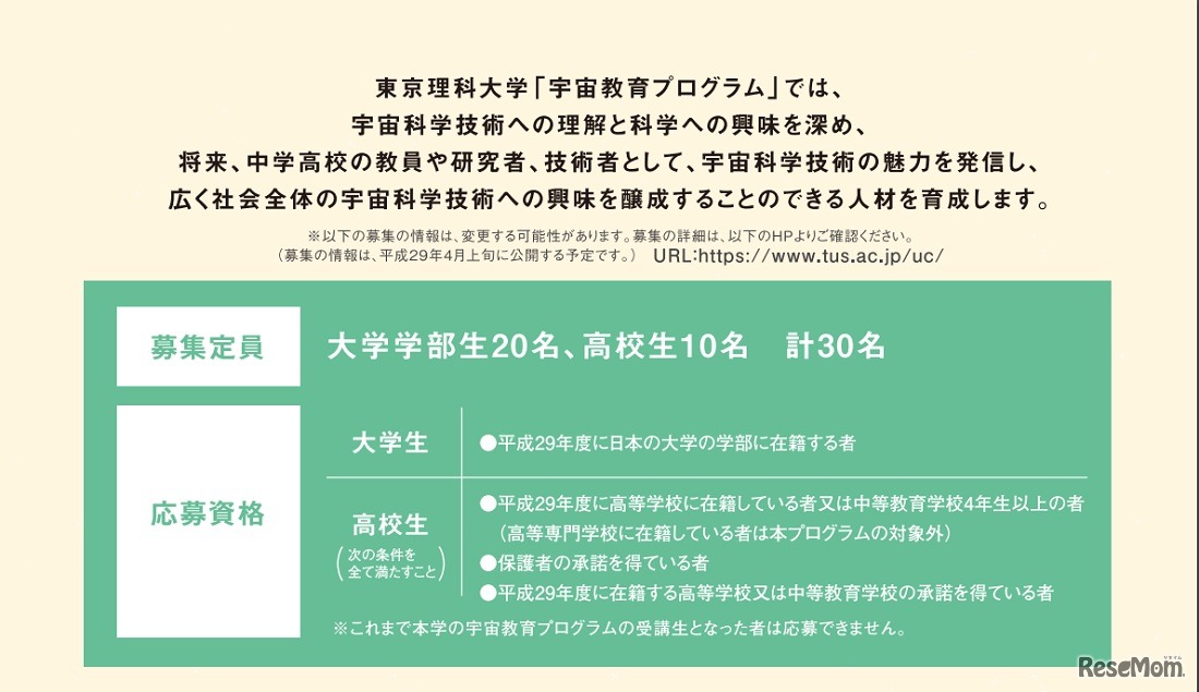 東京理科大学は平成29年度の「宇宙教育プログラム」の受講生を募集する。「本物から学ぶ。」をテーマに講義、講演、体験実習などを行う。対象は大学学部生20名と高校生10名の計30名。事前エントリーは4月4日~24日午後5時まで。