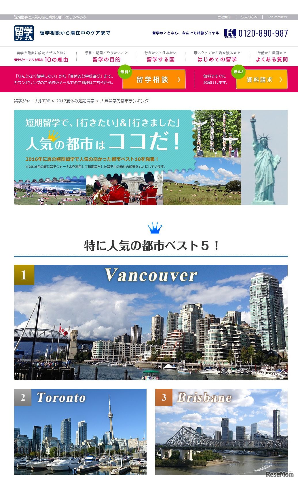 留学カウンセリングや情報誌の制作などを展開する留学ジャーナルは4月9日、2016年夏に留学ジャーナルを利用し短期留学をした先輩留学生に聞いた、人気都市ランキングを発表した。1位はカナダ・バンクーバー。