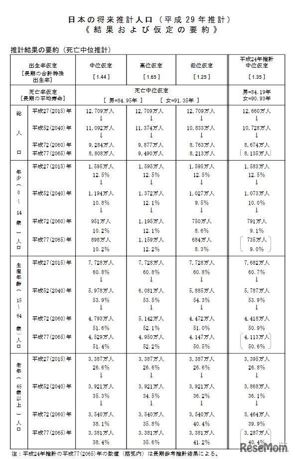 国立社会保障・人口問題研究所は4月10日、「日本の将来推計人口(平成29年推計)」を発表した。平成77(2065)年には、合計特殊出生率は1.44、総人口は8,808万人、年少人口(0~14歳)割合は10.2%と予測している。