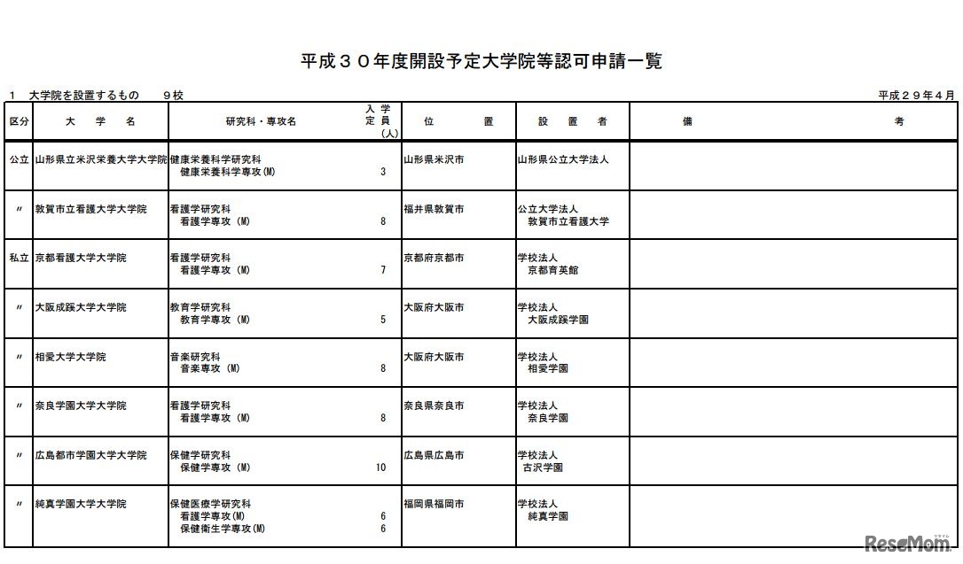 文部科学省は4月10日、平成30年度(2018年度)開設予定の大学の学部・学科の設置認可、大学院の設置認可について発表した。3月末に大学の学部の設置認可を申請した大学は、名古屋市立大学総合生命理学部など22校にのぼる。