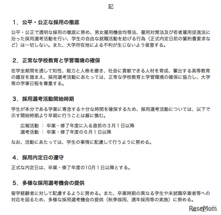 日本経済団体連合会は4月10日、2019年度入社対象者の採用選考に関する指針を発表した。現状と同じく、広報活動は3月1日以降、選考活動は6月1日以降に解禁となる。また、教育効果の高いものであれば、1日限りのインターンシップを実施しても差し支えないとの考えを示した。