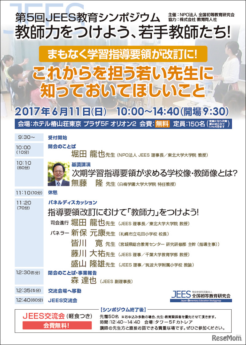 全国初等教育研究会(JEES)は、第5回JEESシンポジウム「まもなく学習指導要領が改訂に!これからを担う若い先生に知っておいてほしいこと」を6月11日、ホテル椿山荘東京にて開催する。参加費は無料。Webサイトにて先着順で申込みを受け付けている。