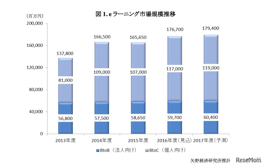 矢野経済研究所は4月12日、eラーニング市場に関する調査結果を発表した。2016年度の国内eラーニング市場規模は、前年度比106.7%の1,767億円を見込み好調に推移した。2017年度も引き続き市場は拡大傾向にあるという。