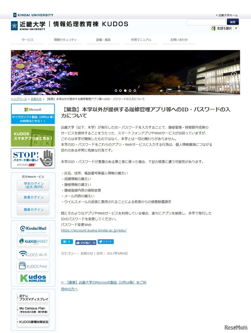 近畿大学 【緊急】本学以外が提供する履修管理アプリ等へのID・パスワードの入力について
