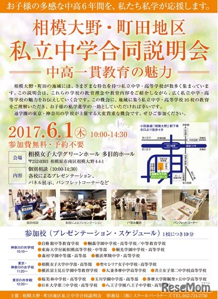 相模大野・町田地区の私立中学合同説明会を、相模女子大学グリーンホール多目的ホールにて6月1日に開催する。東京・神奈川の共学校、女子校から16校が参加。入場無料、予約不要となっている。