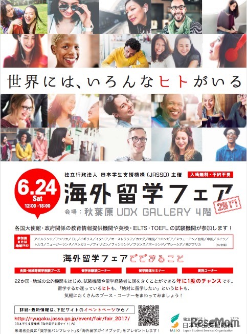 日本学生支援機構(JASSO)が、海外留学を希望する学生・社会人を対象に開催する年に1度のイベント「JASSO海外留学フェア2017」が6月24日に秋葉原UDX GALLERYで開催される。入場無料で予約不要。入退場自由。