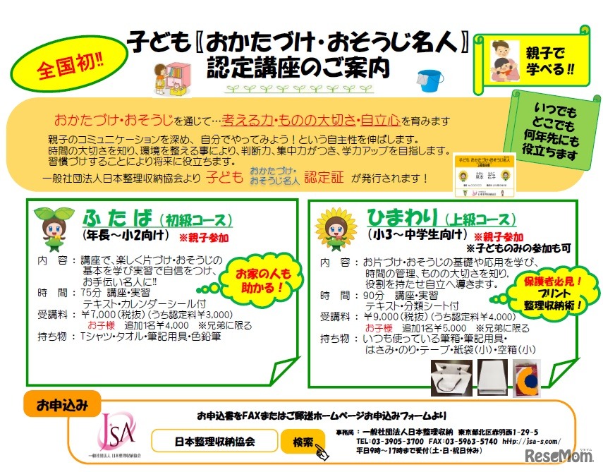 日本整理収納協会は5月28日、親子で楽しく学べる「子どもおかたづけ・おそうじ名人」認定講座を開催する。初級コース「ふたば」は年長~小学2年生、上級コース「ひまわり」は小学3年生~中学生が対象。