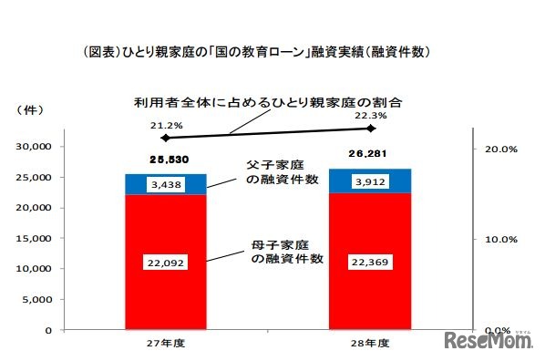 国の教育ローンのうち、ひとり親家庭向けの融資実績は平成28年度が2万6,281件と前年度より2.9%増加していることが、日本政策金融公庫が5月29日に発表した調査結果より明らかになった。
