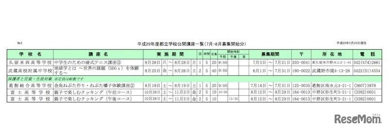 東京都教育委員会は6月9日、「平成29年度都立学校公開講座一覧(7・8月募集開始分)」を公表した。スポーツから自然科学、絵画まで幅広い講座内容を用意。小・中学生や親子向けには、スポーツ教室やクッキング、プログラミング講座などを開講する。