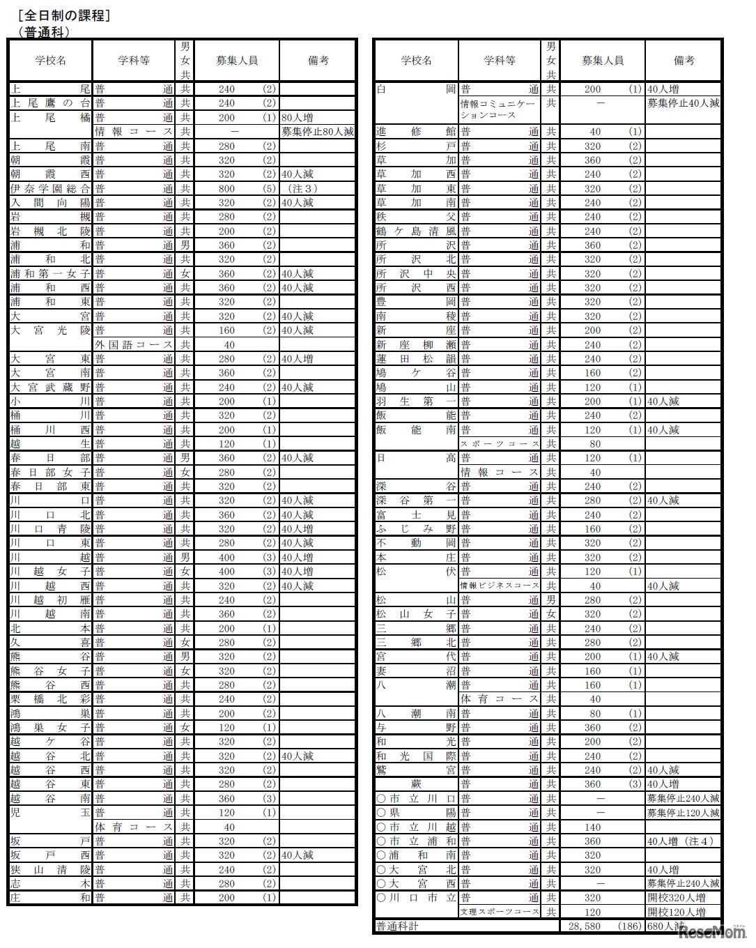 平成30年度(2018年度)埼玉県公立高等学校普通科募集人員