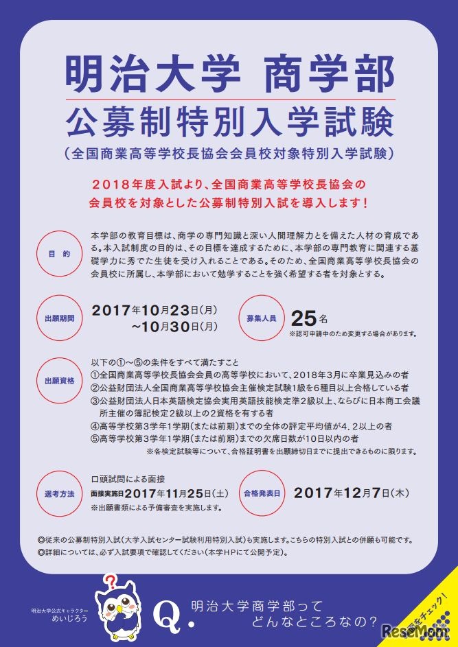 明治大学商学部は、2018年度一般入試に「英語4技能試験利用方式」を導入するほか、全国商業高等学校長協会の会員校を対象とした「公募制特別入学試験」を導入する。新たな入試方式導入により、グローバルに活躍できる次世代のリーダーの育成を目指す。